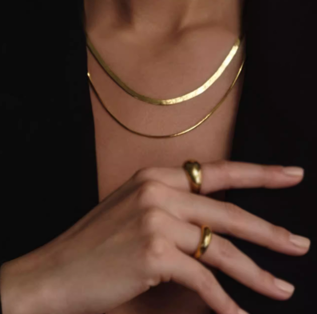 One 4mm herringbone chain and one 1mm herringbone chain. These pieces can be worn together or separately, allowing for endless styling options. The adjustable lengths make layering a breeze, whether paired with other jewelry or worn alone. Each chain is 18K gold thick-plated, ensuring lasting shine and durability.